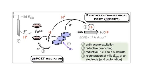 Peters lab has recently introduced a cobaltocene-tethered Bronsted base dimethylanilinium mediators that allows the reduction of several substrates including nitrogen to ammonia in electrochemical setting. It has several advantages including, it prevents electrode poisoning, these mediators can reduce an organic substrate via a concerted PCET (proton coupled electron transfer) requiring lower onset potentials and, the lower onset potential can suppress the competing hydrogen evolving reaction (HER).